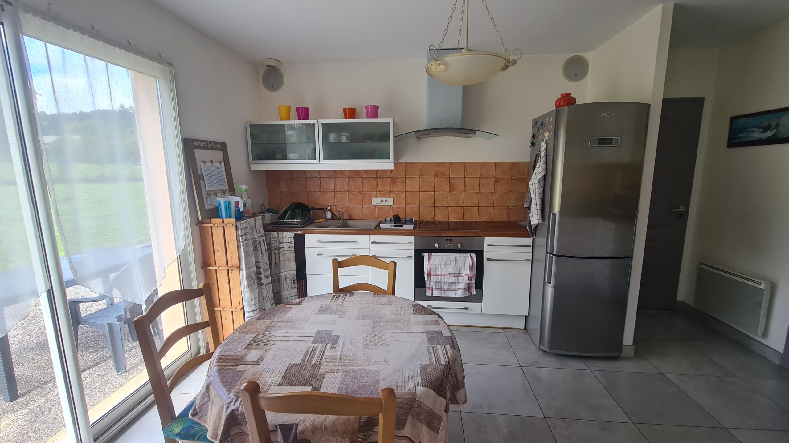Une cuisine équipée ouverte sur le séjour avec un accès vers la terrasse et le jardin