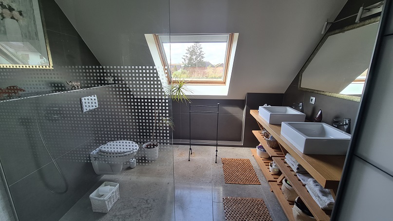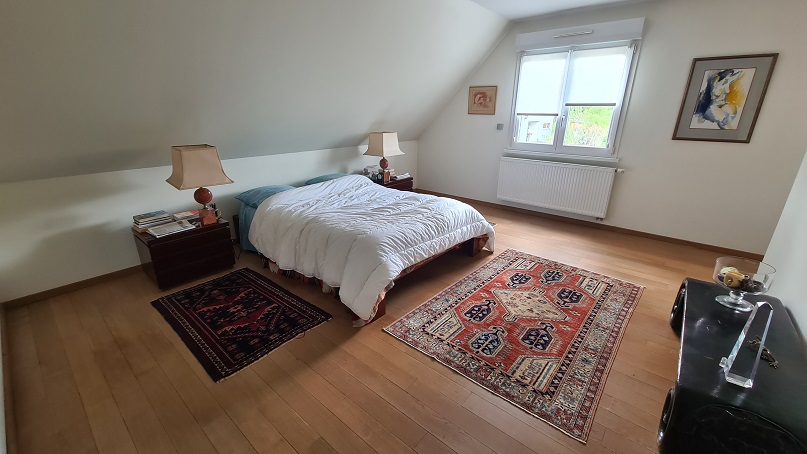 A l’étage : Une mezzanine, deux chambres, une salle d’eau avec WC, une suite parentale composée d’une chambre-dressing avec sa salle de bains : baignoire – douche – toilette.